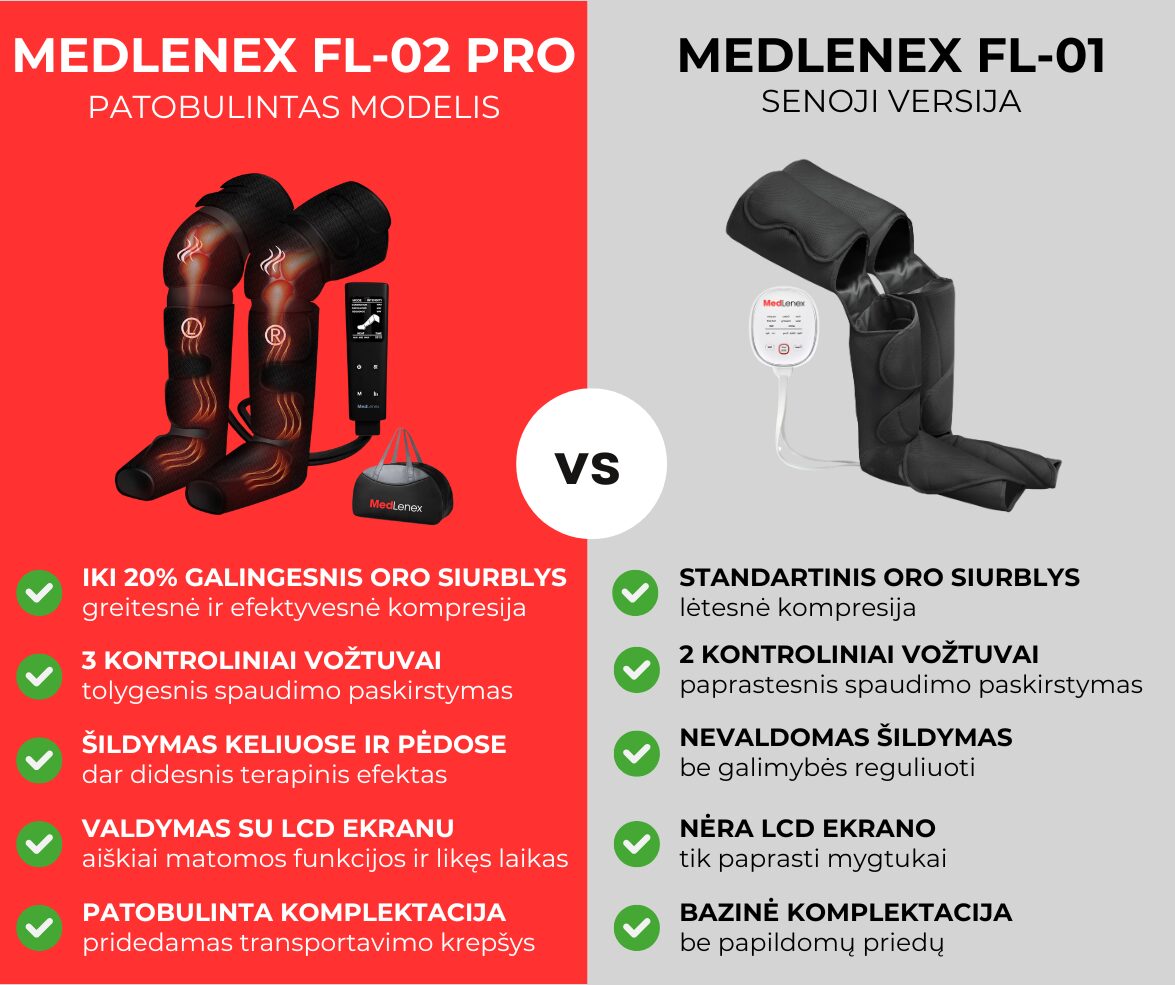 MEDLENEX FL-02 PRO – tai naujos kartos limfodrenažinis prietaisas, sukurtas pagerinti kraujotaką, sumažinti edemą ir palengvinti kojų nuovargį. Šis modelis – tai patobulinta FL-01 versija, pasižyminti dar galingesniu veikimu, papildomomis funkcijomis ir moderniu LCD ekranu. Puikiai tinka naudoti namuose, reabilitacijos, fizinės terapijos ir sveikatingumo klinikose.